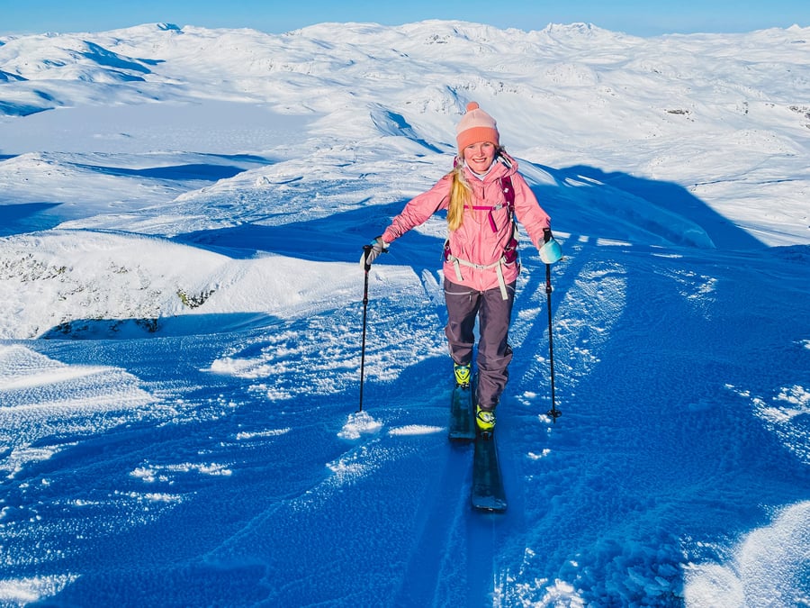 Han fikk selvsagt rett når det gjaldt været, så nå vandrer vi oppover mot Skagadalsbreen under en blå himmel. Skyene bare forsvant. Det ligger 20 cm nysnø i terrenget, og Storen speiler seg i mørke solbrilleglass.
