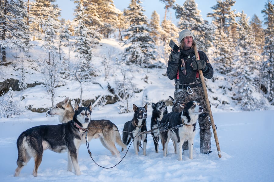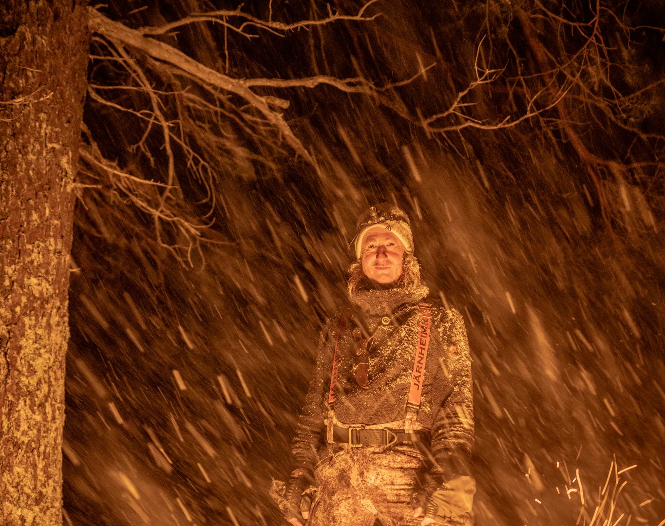 Gjennom en hvitkledd skog, over et fjell og ned mot en ny skog. Høye kneløft gjennom lett puddersnø, mens tunge skyer henger over terrenget nord i Trøndelag. Hvite dotter daler tett gjennom lufta.