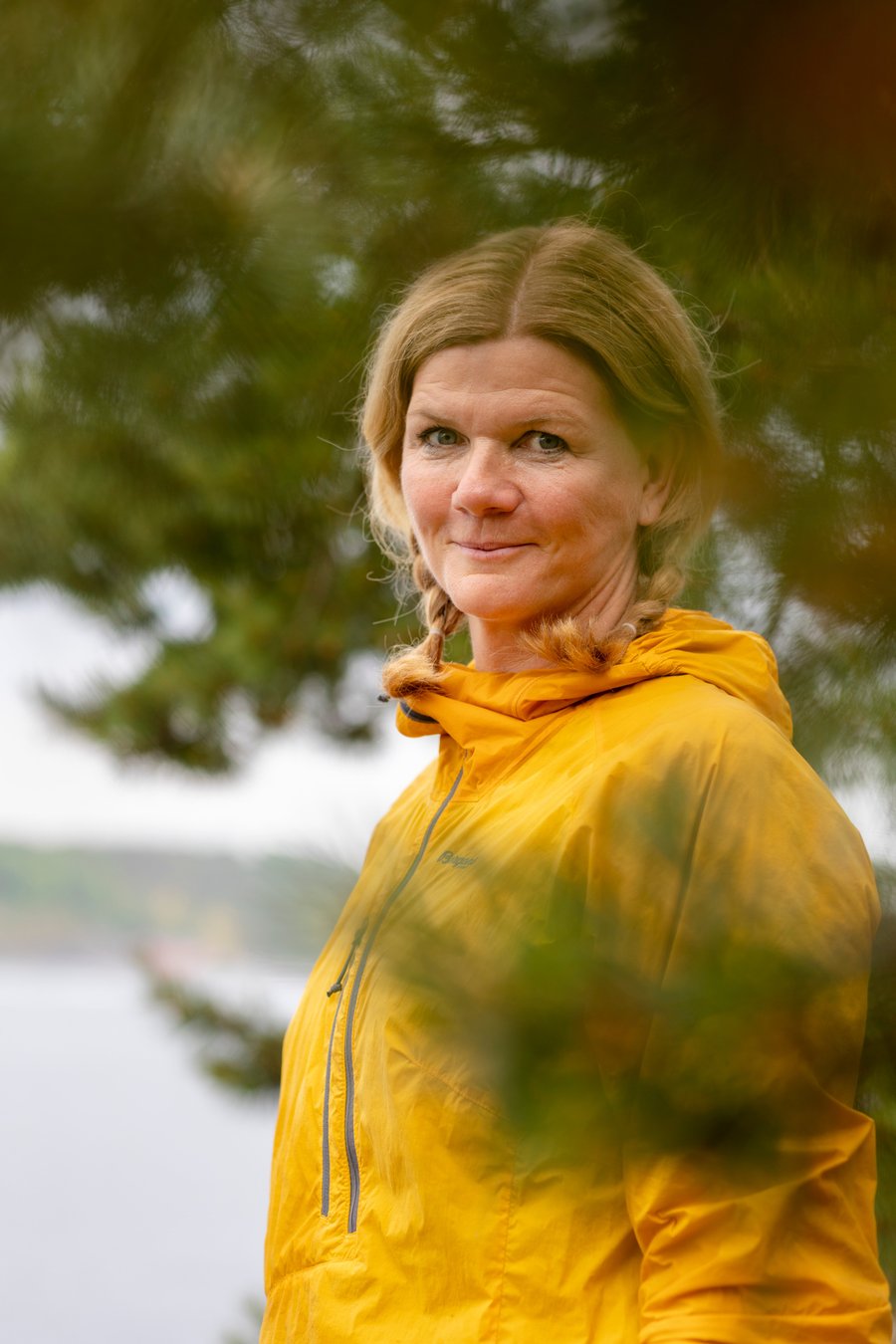 «Her går jeg ofte», sier hun, og peker på en smal sti. «Der borte er det utrolig fint», sier hun, og retter fingeren mot et lite tjern. «Herfra og opp mot Mariholtet er barndommen min – kort oppsummert», sier hun, og klyver raskt over en veltet rot.