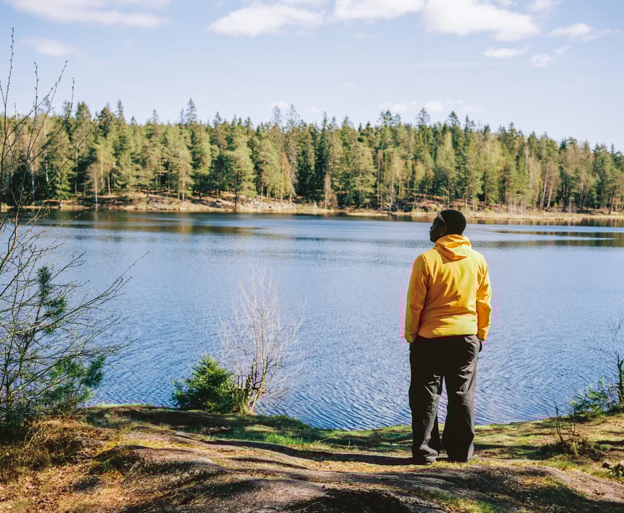Safari har termoskoppen i hånda og peker bort mot andre siden av tjernet, fra den rustikke trebenken midt i Oslomarka.