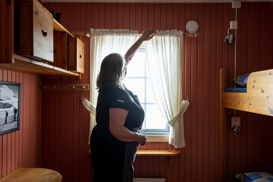 Solbjørg har selv vært med på å gi navn til hyttas mange rom: Vinjebue og Steinbue. Grotten. Breførerbue. Og Brudesuiten («det er det eneste rommet med dobbeltseng, og der inne pleier vi å si at alt er lov»).