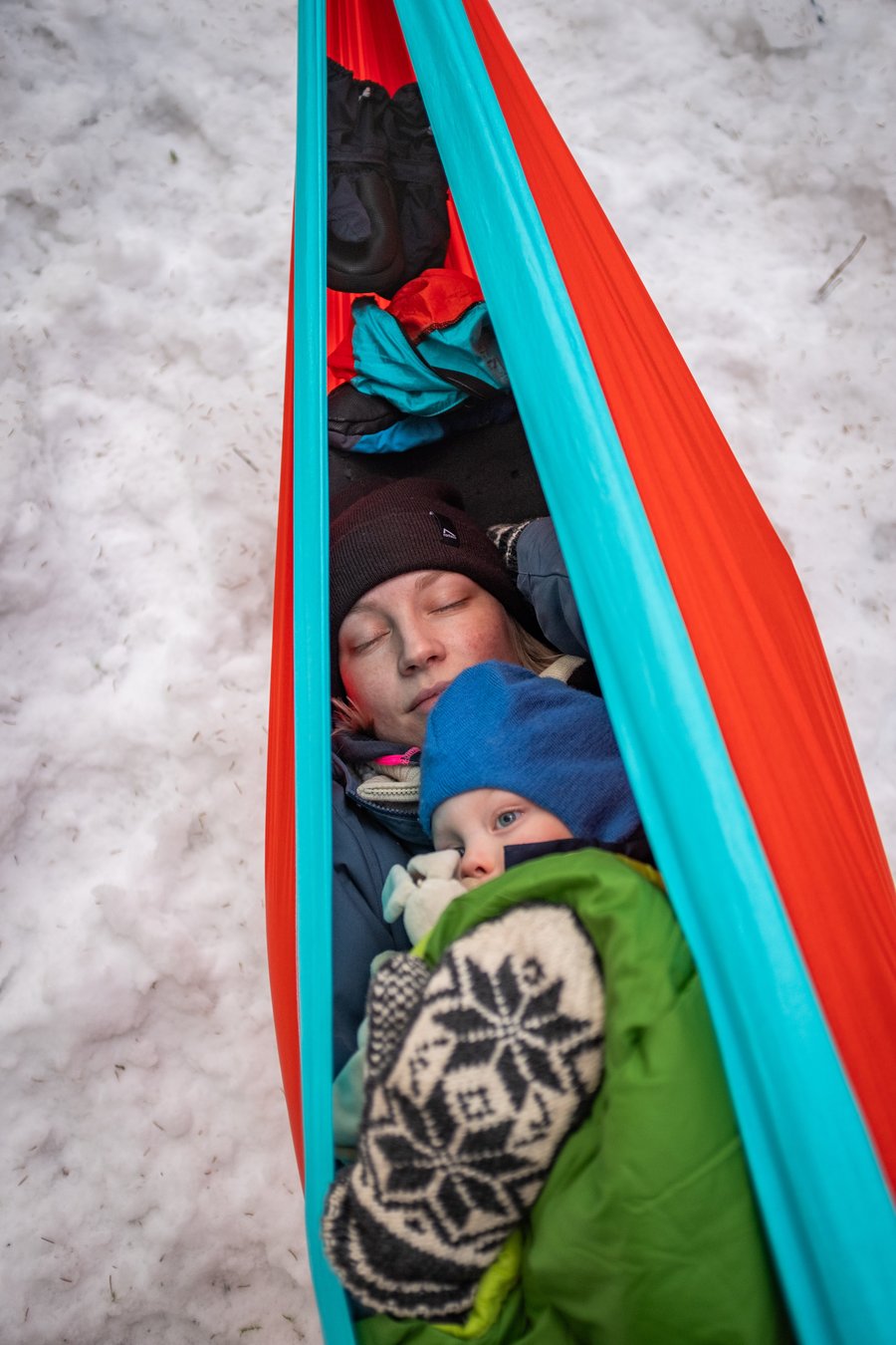 Om du skal utvide tidsrommet man kan tilbringe ute, er det et enkelt, men godt tips å lage et hi. Det vil si et sted hvor ungen(e) kan roe ned uten å fryse. Hiet kan for eksempel være en lun plass under åpen himmel, ved et bål, i en hengekøye, under en gapahuk eller kanskje til og med inne i et telt.