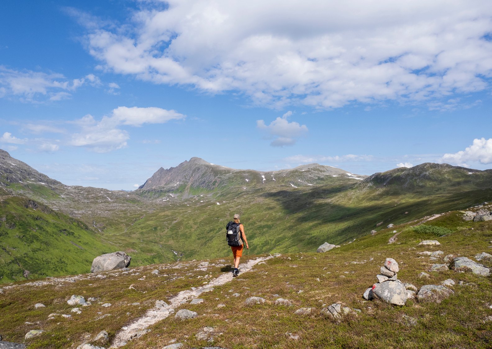 Stien er lettgått og terrenget er åpent, grønt og frodig. Nå midt i fellesferien – eller la oss kalle det fjelletsferien – er sommeren i full gang, men her på Hinnøya er det langt fra folksomt.