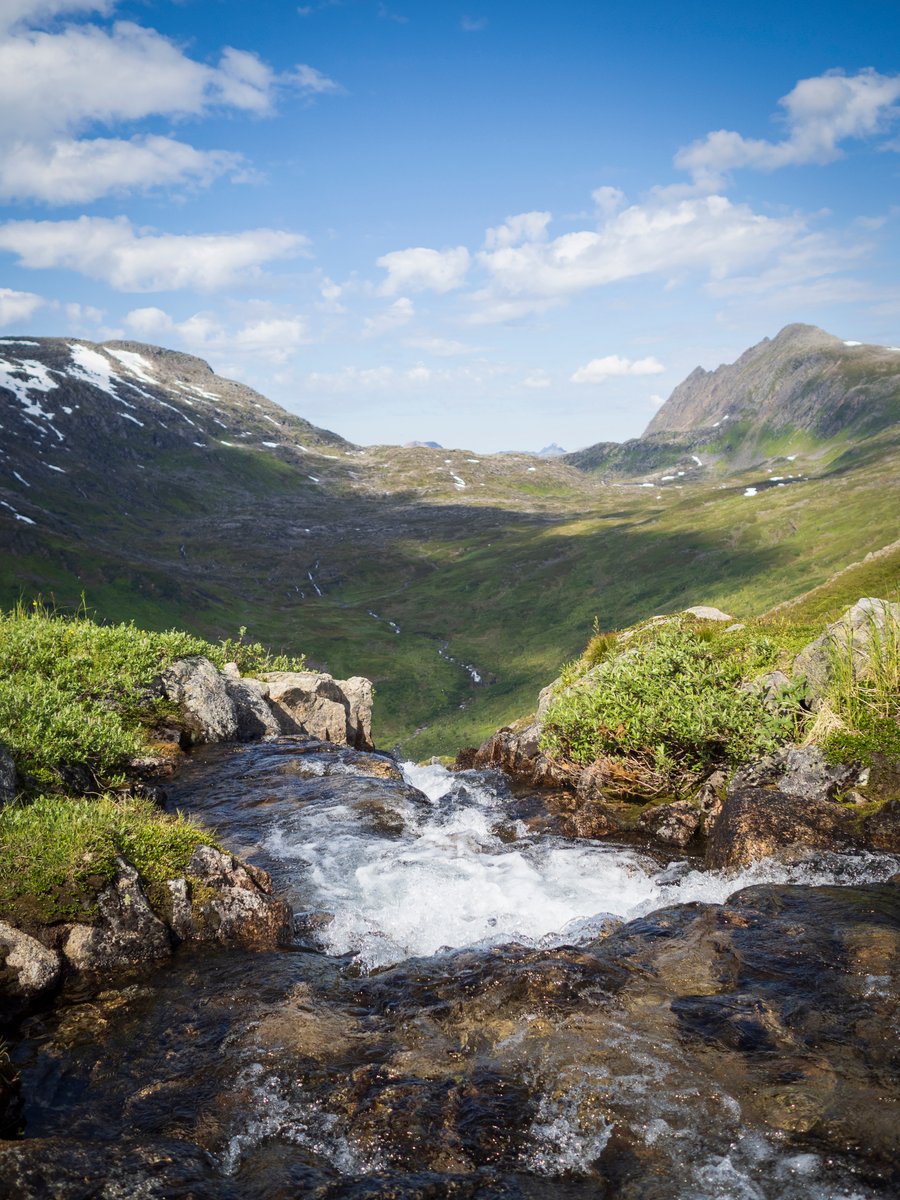 Idet jeg starter turen fra Fiskefjorden, ligger det et slørete skylag som et tynt filter foran sola. Tidvis skyter strålene igjennom og blinker lekent i bekken. På de høye toppene omkring er det fremdeles store snøflekker som vitner om en sen vår.