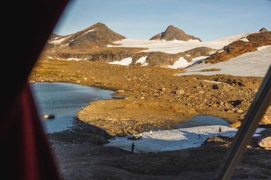 Så bikker du over kanten, hvor Okstindan, Okstindbreen og Rabothytta bretter seg ut foran deg.
